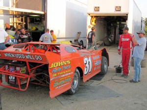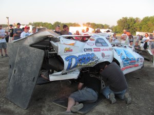Heat #6 proved to be the most action packed as drivers were vying for the win and its corresponding coveted #1 starting spot for the nights 100-lap Main Event. Although Jimmy Mars (no.28) and Dale McDowell (no.17) battled side by side for second as they hunted down Brian Shirley’s no.3 machine, with just a handful of laps left things went terribly wrong. Mars ended up on top of the front stretch wall and took a wild ride that included getting caught on a support bar and having the car whip around and begin a series of barrel rolls. Thankfully Mars emerged from the car unscathed, but his no.28 will never be the same for sure.