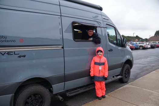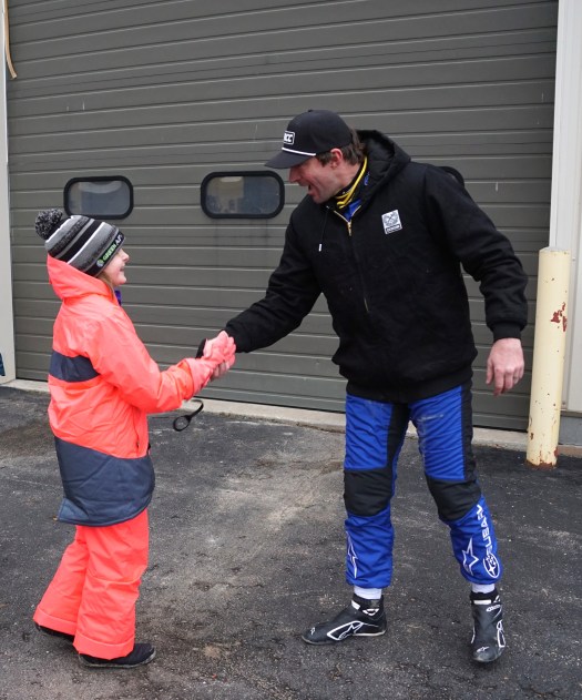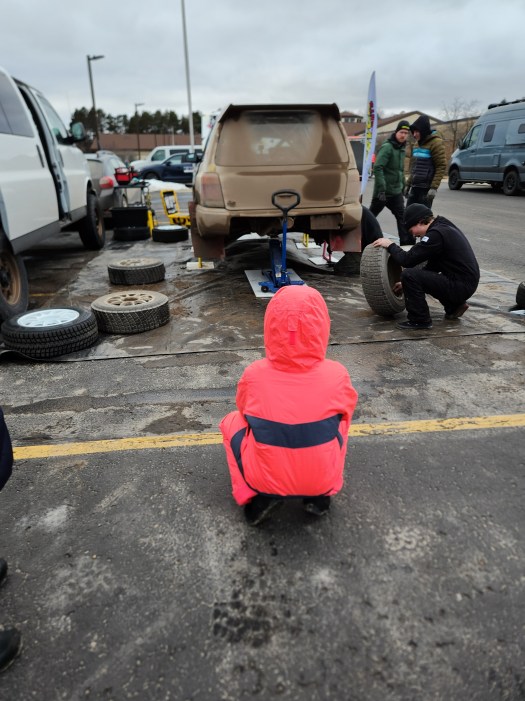 The car is so cool and different looking being a little bigger and boxier than the others. I called it the “confetti car” because of the stickers. I learned that this was the first race using this car and that driver Tayler Hoevenaar and his team built it and they are from right here in Michigan (by Grand Rapids). I got to watch them and talk to them during the service. They had to work hard to get all the mud and slush out of the wheels and brakes.