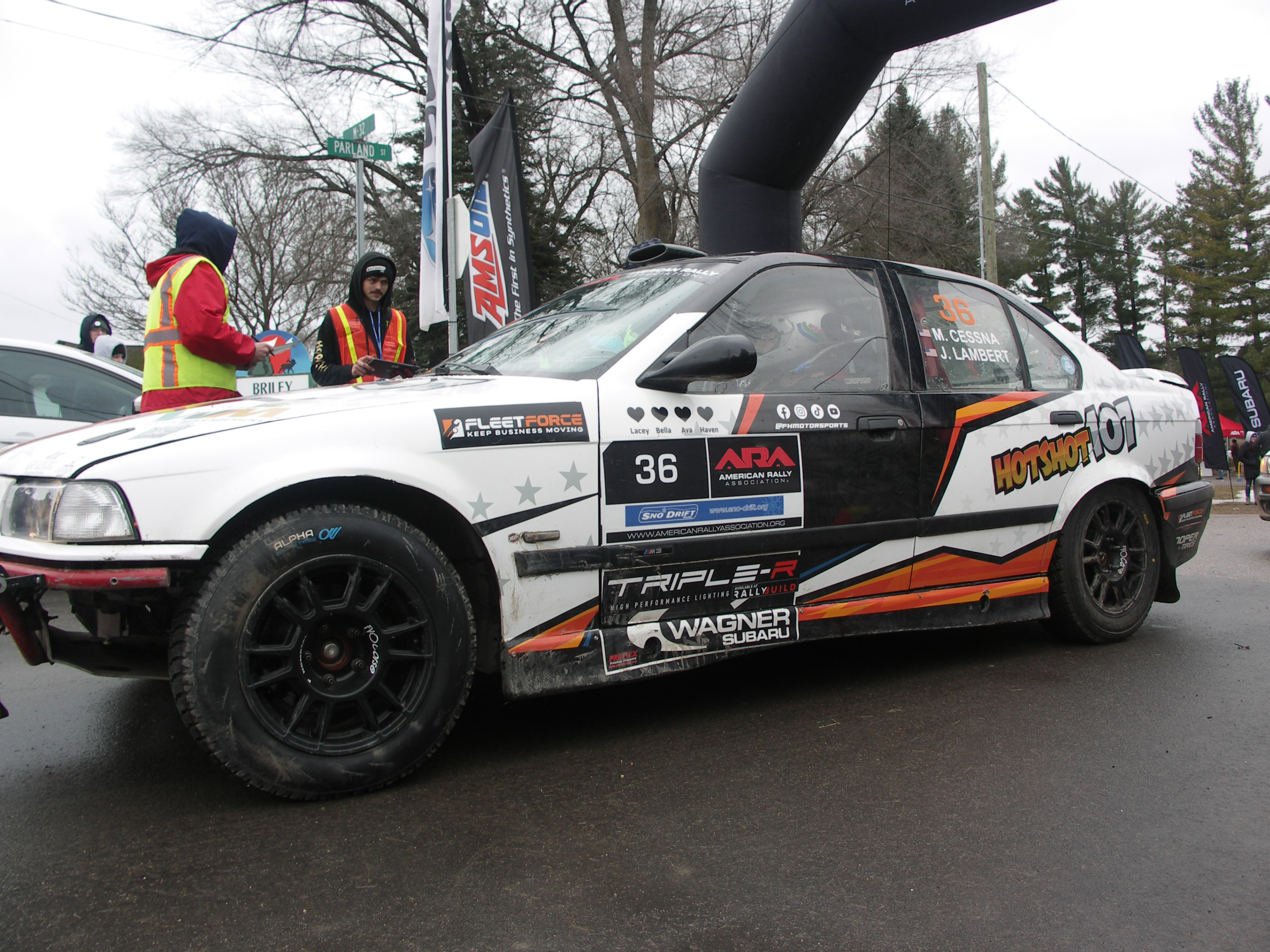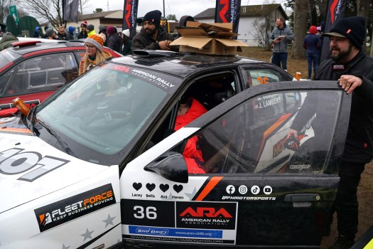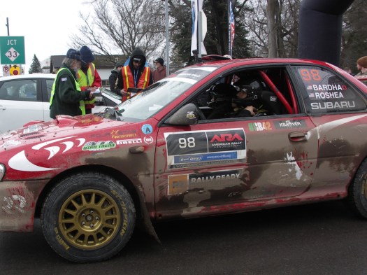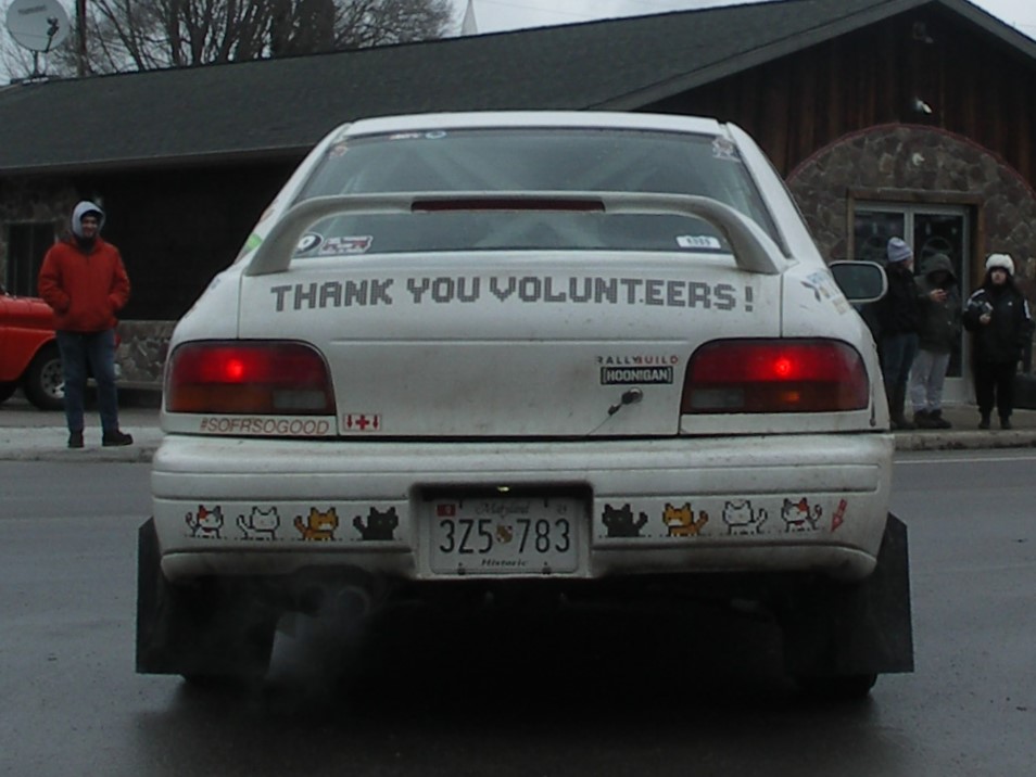 Sno-Drift is a timed racing event, timed racing means that one car goes out on the stage and then the starter waits an assigned amount of time (usually 1-3 minutes) before they send out the next car. The cars are timed from the start of the stage to the finish. Each team has to check into their start time on the exact minute and they have a card that the volunteer starter has to sign and time stamp. If they don’t check in their time they will get a penalty, so you will see cars waiting in line to check in on their minute.