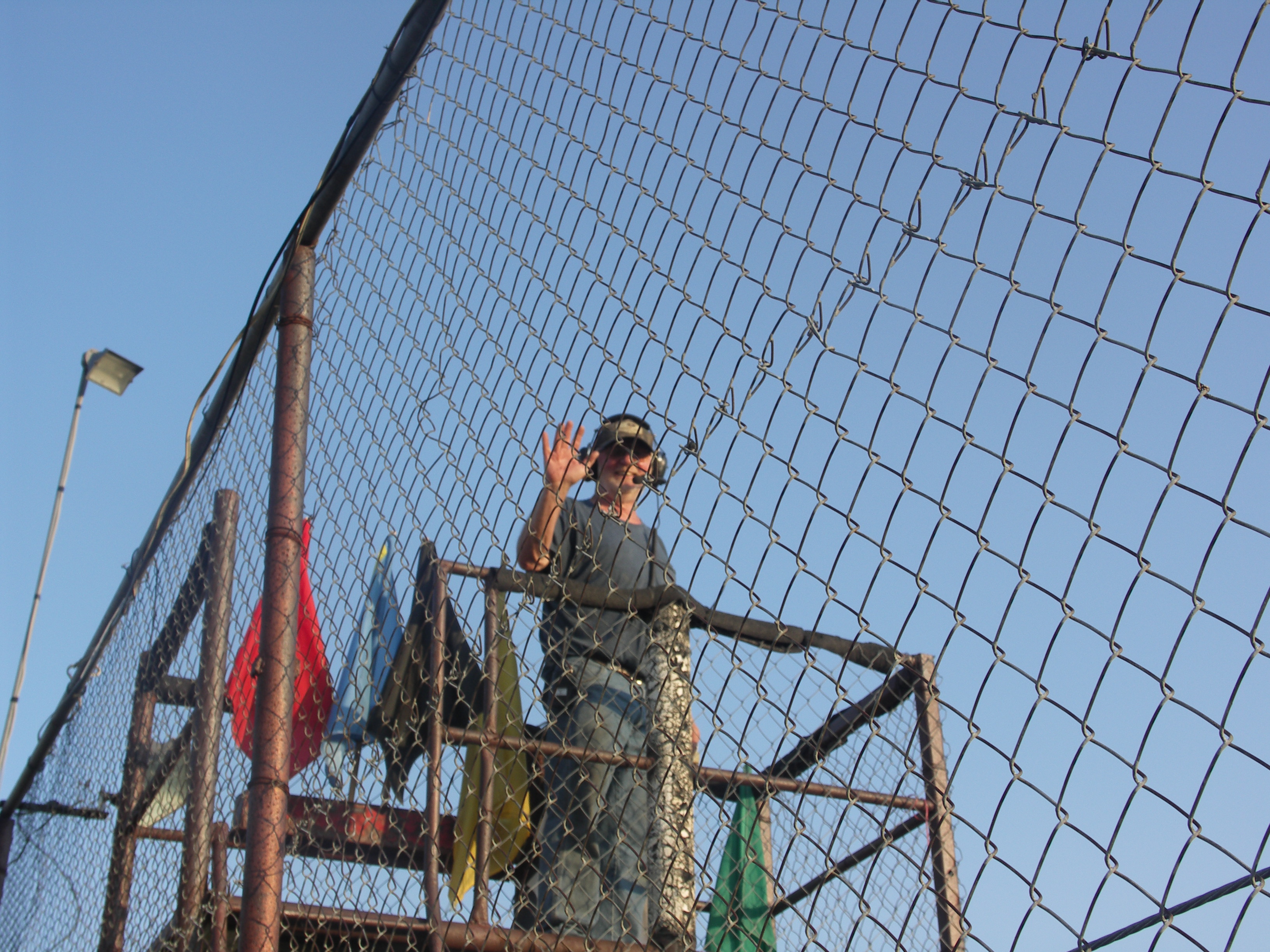 Flagman Don Sevenski takes time to give a wave from the crows nest at Northern Michigan Speedway (DeLayna Dubie photo)