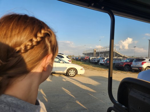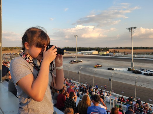 Owosso is a beautiful racetrack. We sat on the backstretch in huge comfortable grandstands. The grandstands are fully enclosed which made me feel so safe and comfortable, and they have really awesome handicap accessible areas at different levels so that even from a wheelchair you can enjoy watching the races and still be by your family. I also think that it is awesome that they have a shuttle service to and from the parking lot, so with my newly healing broken leg I got to ride in a limo style golf cart instead of having to walk too far.